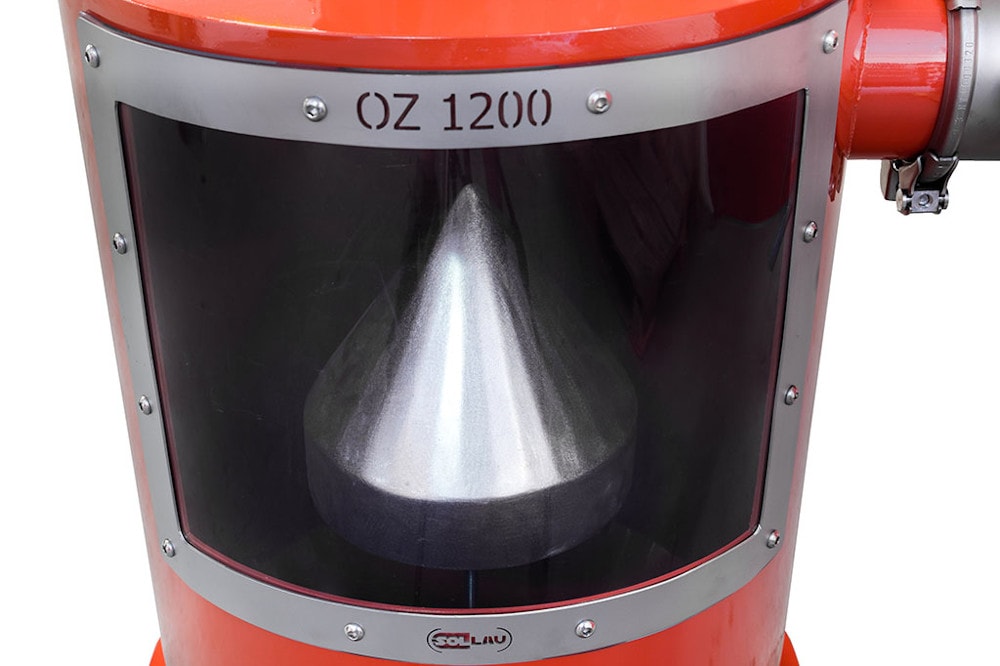 Le dépoussiéreur est destiné à aspirer la poussière des plastiques broyés. Par le haut, les granulats en plastique sont versés via un tamis et un déflecteur réglable en hauteur. L'aspiration latérale permet d'aspirer en permanence, depuis les granulats tombant par le corps du séparateur, les poussières fines indésirables, les granulats purifiés tombent alors sous le corps de l'équipement de dépoussiérage dans le récipient de transport final, big bag, etc.