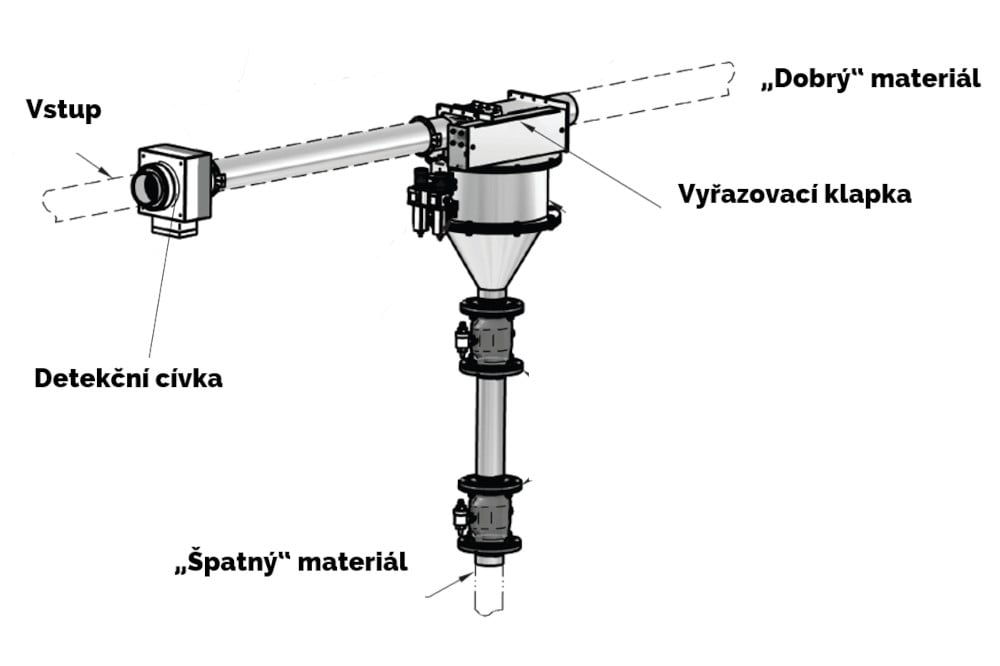 Le détecteur de métaux de la gamme P-TRON est installé sur une tuyauterie qui assure le transport pneumatique de produits friables. La matière contrôlée traverse une bobine de détection. Si la matière contient des inclusions ou des contaminants métalliques, la bobine détectera la présence de ces métaux et émettra un signal entraînant l’ouverture du clapet d’éjection. Le contaminant métallique et une petite quantité de matière seront redirigés vers la trémie de la matière « pas bonne ». Le clapet reprendra ensuite automatiquement sa position d’origine. Le fonctionnement du détecteur et celui de l’éjection des contaminants sont totalement automatiques.