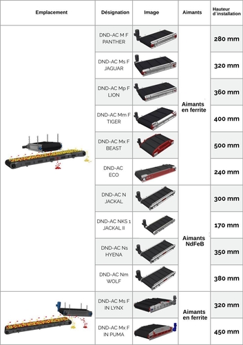 Dans cette gamme, vous trouverez des modèles équipés d’aimants en ferrite et d’autres équipés d’aimants néodymes très puissants. Ces modèles pourront être suspendus au-dessus du convoyeur, à la perpendiculaire de la bande (installation transversale) ou être installés de manière longitudinale au-dessus du déversement (rouleau final). Chaque gamme de modèles a été conçue en fonction de conditions d’exploitation spécifiques et en fonction de la profondeur de champ magnétique souhaitée par le client.