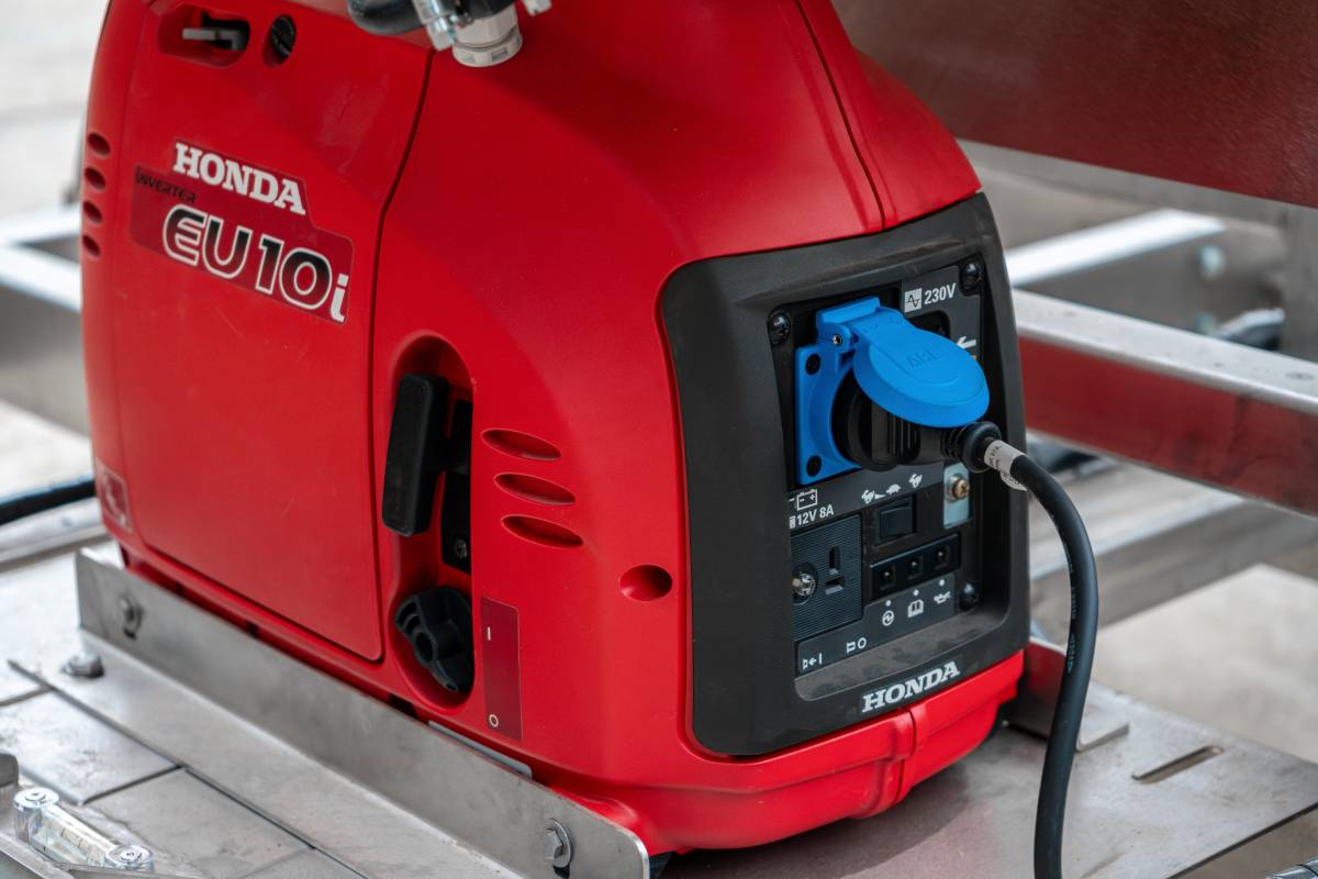 - Groupe électrogène à essence muni d’un inverteur (1 kW) intégrant un réservoir de 120 litres d’essence, une batterie de secours (150 Ah) et un phare d’avertissement. Lorsque le réservoir est plein, l’autonomie de la croix lumineuse sera d’une semaine en envisageant une intensité d’éclairage maximale en journée.