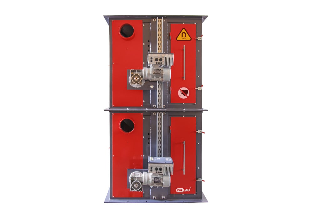 Cette structure modulaire permet de superposer plusieurs modules les uns sur les autres en fonction des demandes du client et d’obtenir ainsi un très haut niveau d’épuration des impuretés avec jusqu’à cinq étages de séparation. De plus, les cylindres magnétiques de grand diamètre font que le matériau est présent dans le champ magnétique pendant plus longtemps et permettent donc une plus grande efficacité de la séparation ainsi qu’une plus grande capacité du séparateur.