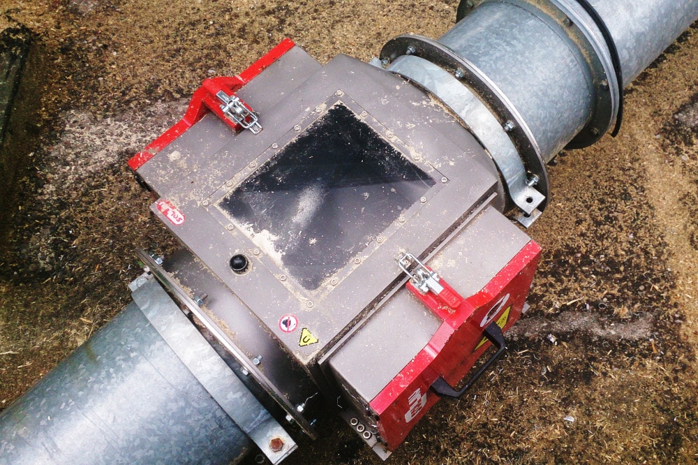 Le caisson magnétique est constitué d'une armoire en inox soudé, qui devient, après raccordement, la partie intégrante du système de la tuyauterie. L'entrée dans le corps du trieur magnétique est équipée d'un déflecteur qui oriente le flux de matériau directement vers les plaques magnétiques et assure ainsi une efficacité maximale du processus de séparation.